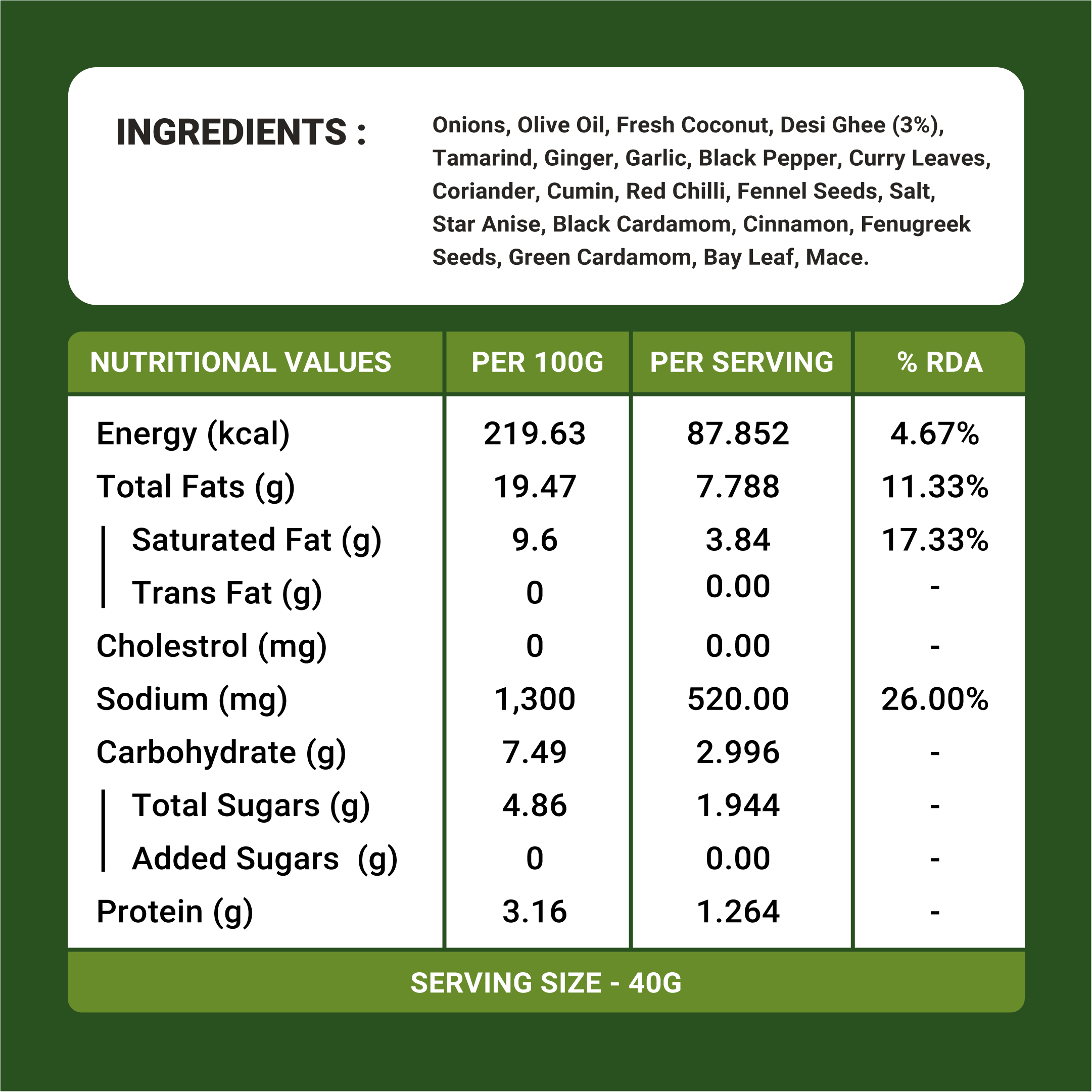 Onions, Olive Oil, Fresh Coconut, Desi Ghee (3%), Tamarind, Ginger, Garlic, Black Pepper, Curry Leaves, Coriander, Cumin, Red Chilies, Fennel Seeds, Salt, Star Anise, Black Cardamom, Fenugreek Seeds, Green Cardamom, Bay leaf, Mace