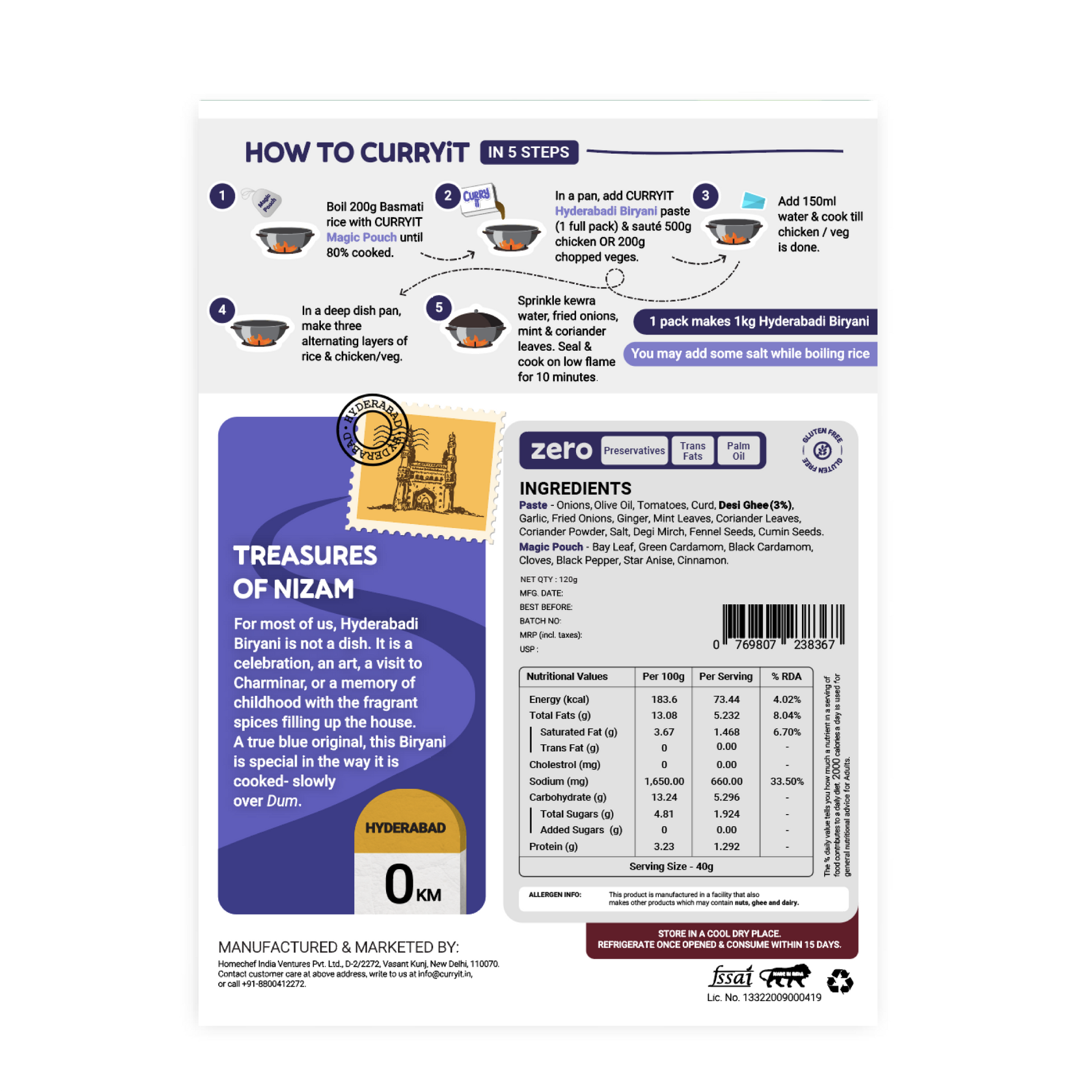 Curry Paste: Onions, Olive Oil, Tomatoes, Curd, Desi Ghee (3%), Garlic, Fried Onions, Ginger, Mint Leaves, Coriander Leaves, Coriander Powder, Salt, Degi Mirch, Fennel Seeds, Cumin Seeds CURRYiT Magic Pouch: Bay Leaf, Green Cardamom, Black Cardamom, Cloves, Black Pepper, Star Anise, Cinnamon