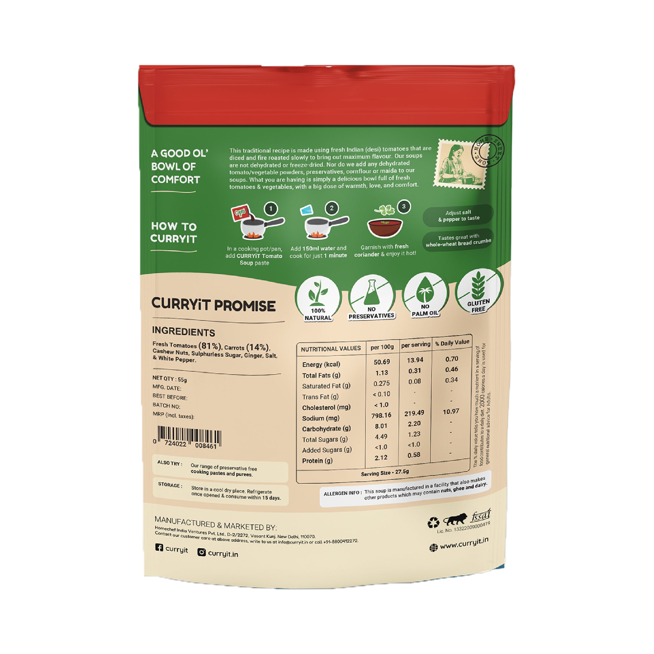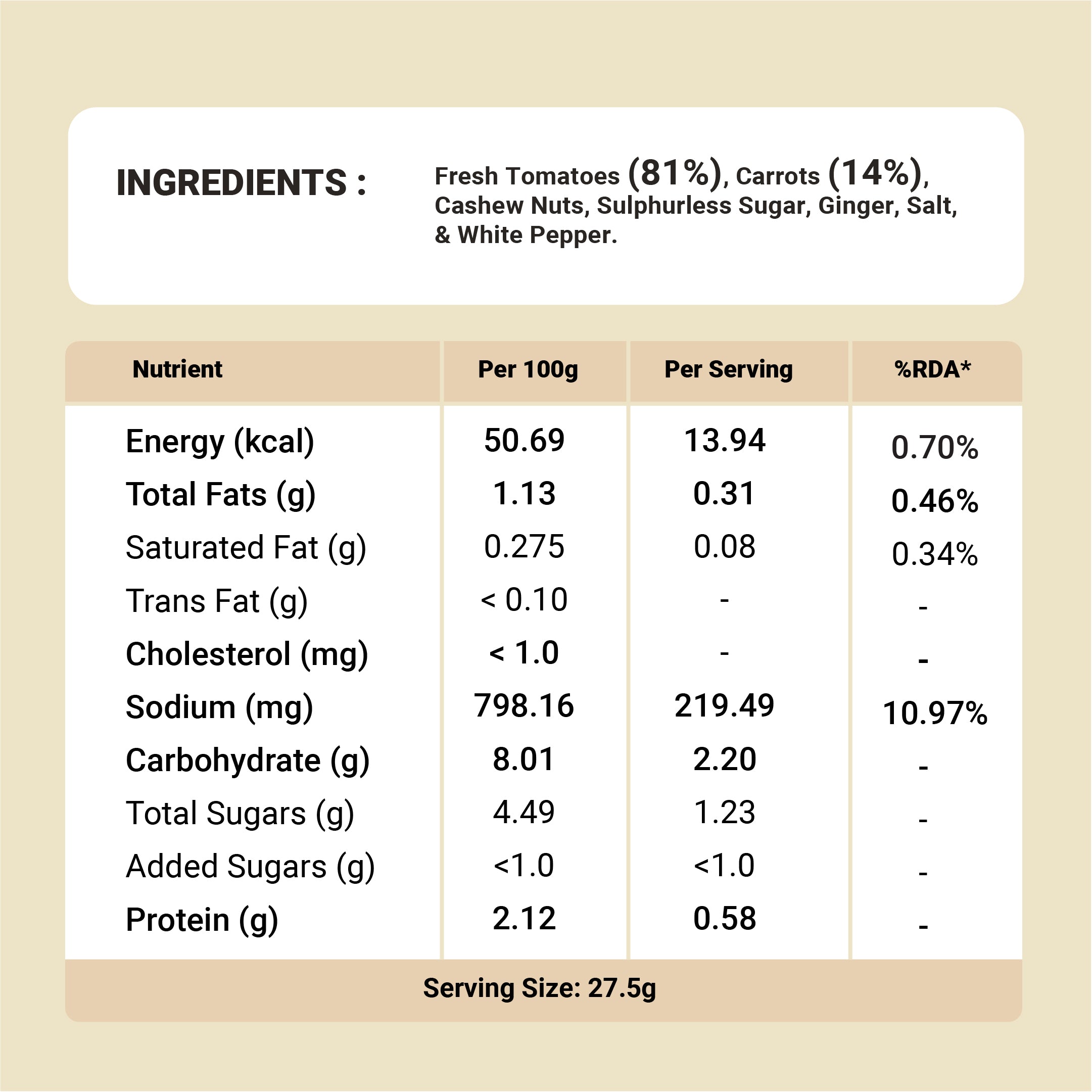 Fresh Tomatoes (81%), Carrots (14%), Cashews Nuts, Sulphurless Sugar, Ginger, Salt & White Pepper.